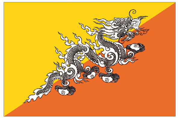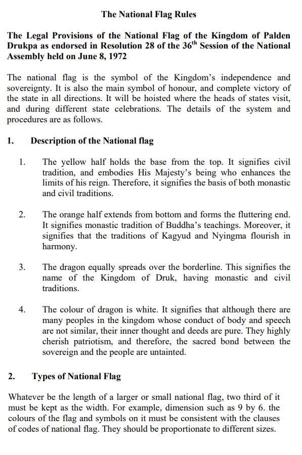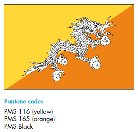 The yellow half holds the base from the top. The orange half extends from bottom and forms the fluttering end. The dragon equally spreads over the borderline. The colour of dragon is white. Whatever be the length of a larger or small national flag, two third of it must be kept as the width.