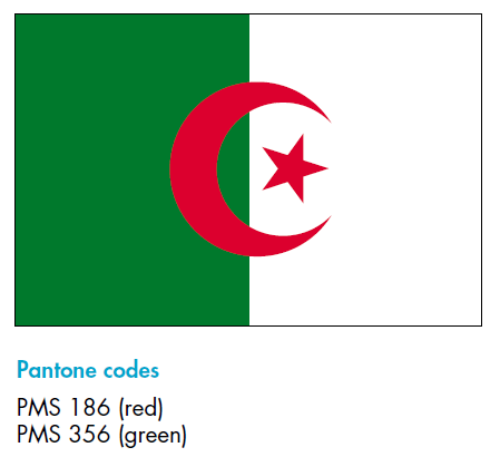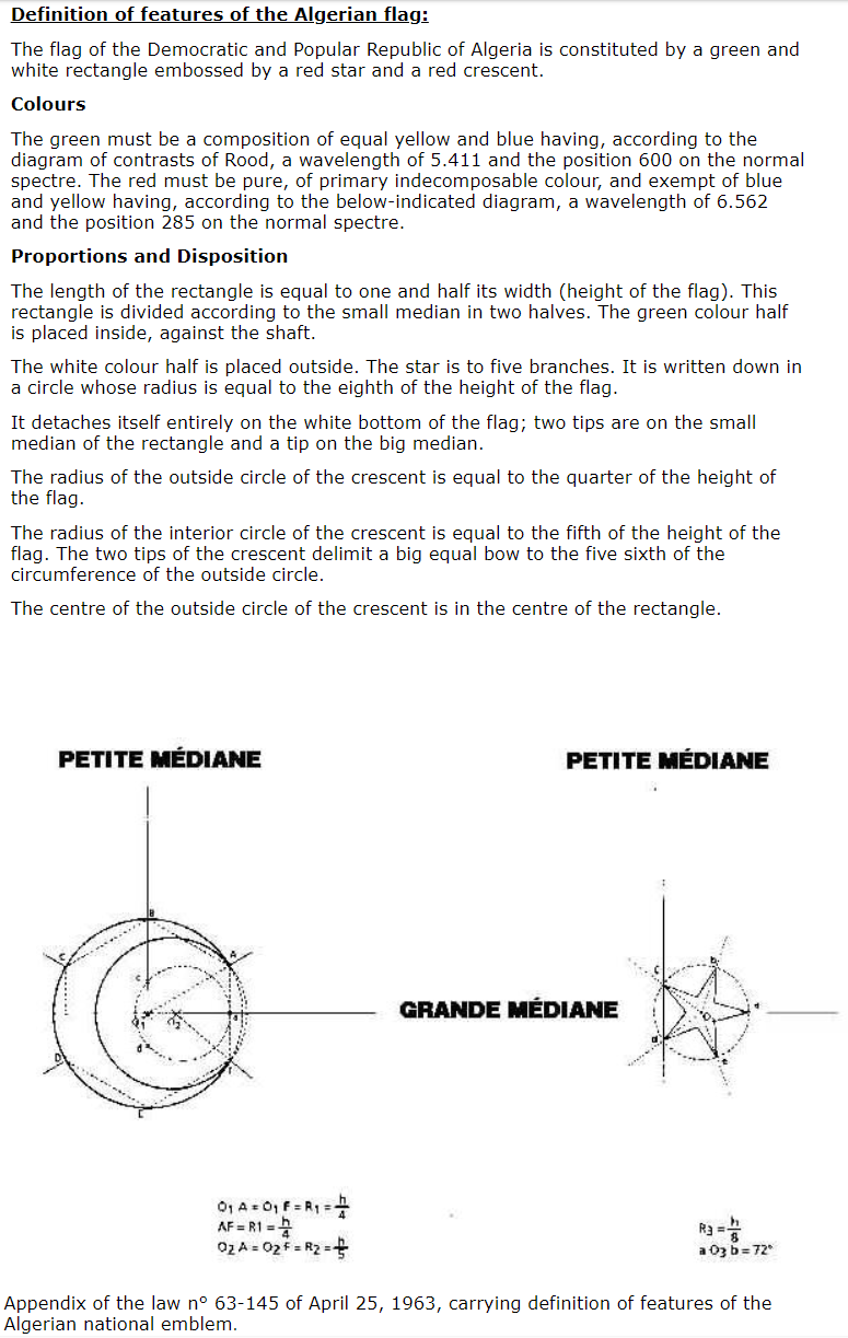 The flag of the Democratic and Popular Republic of Algeria is constituted by a green and white rectangle embossed by a red star and a red crescent.